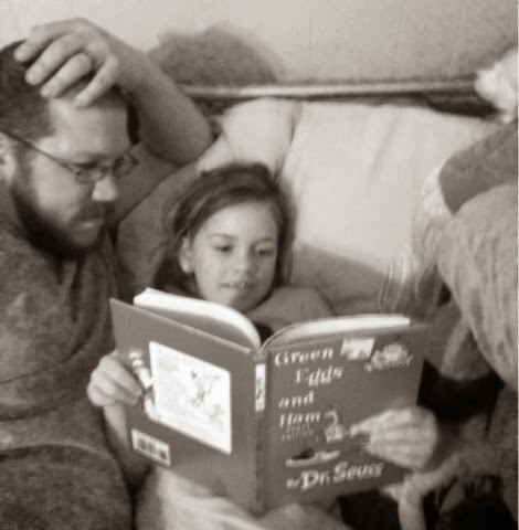 Our daughter is learning to read so she typically starts the story by herself and we finish when she's ready to stop. Green Eggs and Ham gets rather long-winded about half-way through, so that's usually when Mommy or Daddy take over. (And side-note, my hubby really dislikes reading out loud and isn't generally a big reader at all, so it's a step out of his comfort zone to do this for his kids.)